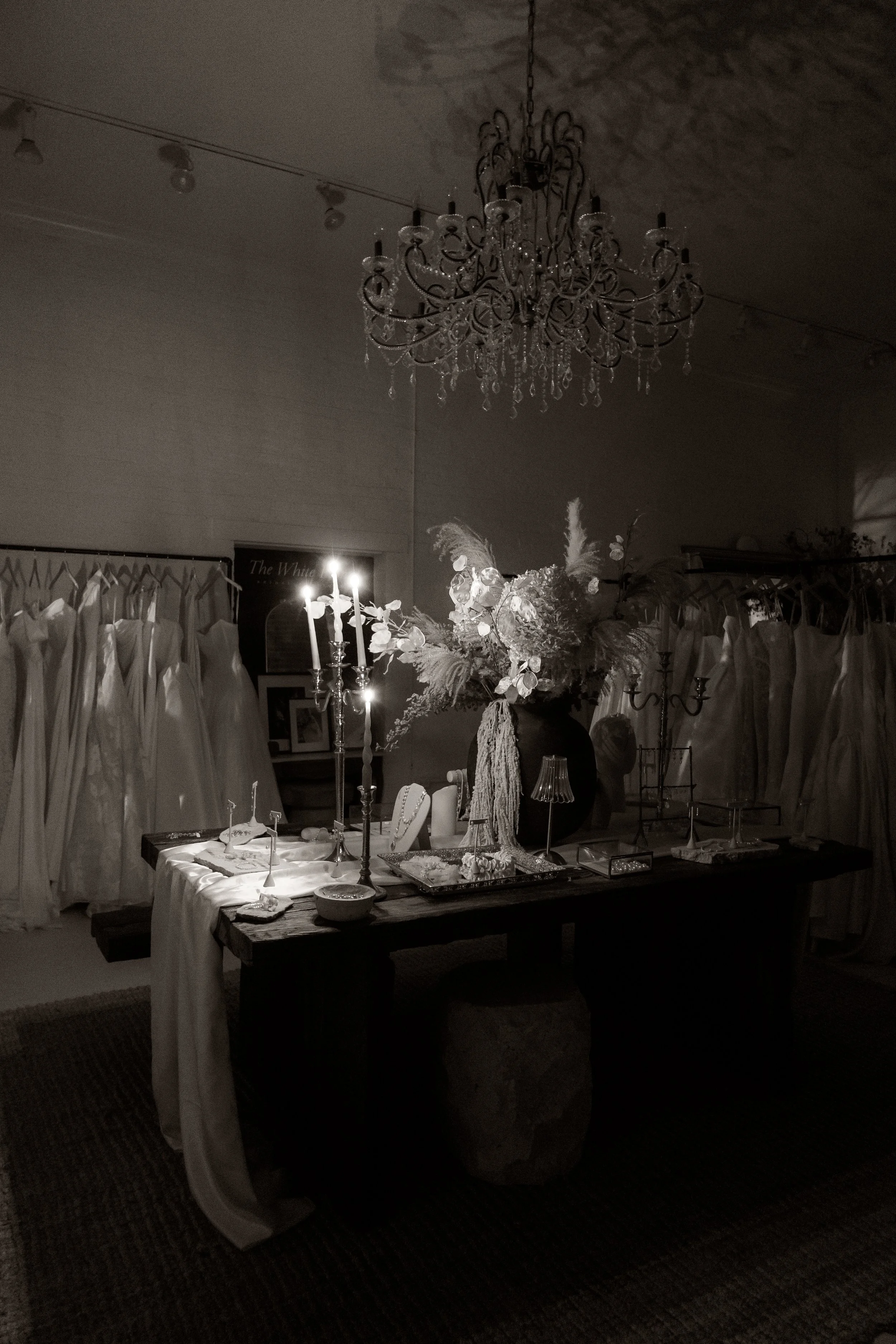 This is when we feature one designer’s complete collection of dresses for a limited amount of time. This provides brides with an opportunity to order a dress from said designer that is not carried in our permanent dress collection, and a 10% trunk show discount is often associated when purchasing during. These typically take place in our shop once or twice a year. Keep your eyes on our Instagram for updates and special events!